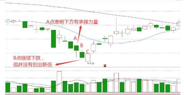 个股在经过较长时间的下跌过程后,其中的参与者几乎是处于高度亏损之中,但是下方的量能并没有放大,就表明个股中的浮筹已经被打出去了,剩下的就是坚定持有者,我们看到A点在创出新低之后,第二天小幅下探之后就迅速拉涨,收出一个小阳线反包前一天的小阴线,随着第二天C点的高开高走,就表明市场已经完成了探底动作,后面就是拉升行情,因此这种在低位出现小阳线的时候,一定要结合第二天的行情变化,来判断个股行情是否是出现止跌回升的走势。